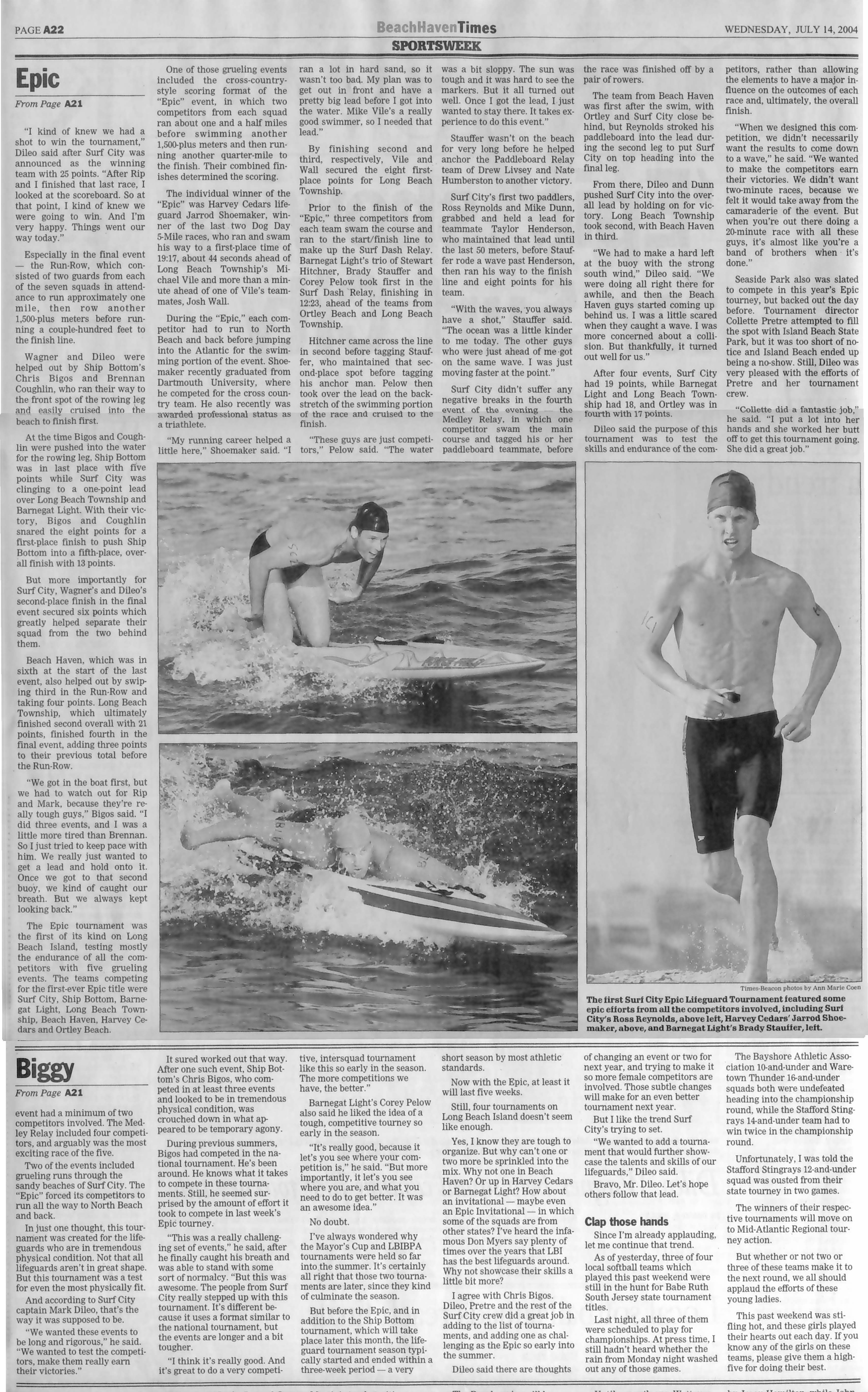 All of the island teams attended the tournament, as well as Ortley beach, which always has a strong competition team. The first event of the tournament was its namesake, the Epic. Rip and I took on this event and quite literally got worked by the competition. Jared from Harvey Cedars was untouchable while the boys from LBT were strong taking 2nd and 3rd in the event. After the cross-country type scoring was calculated Surf City was in 5th place.
