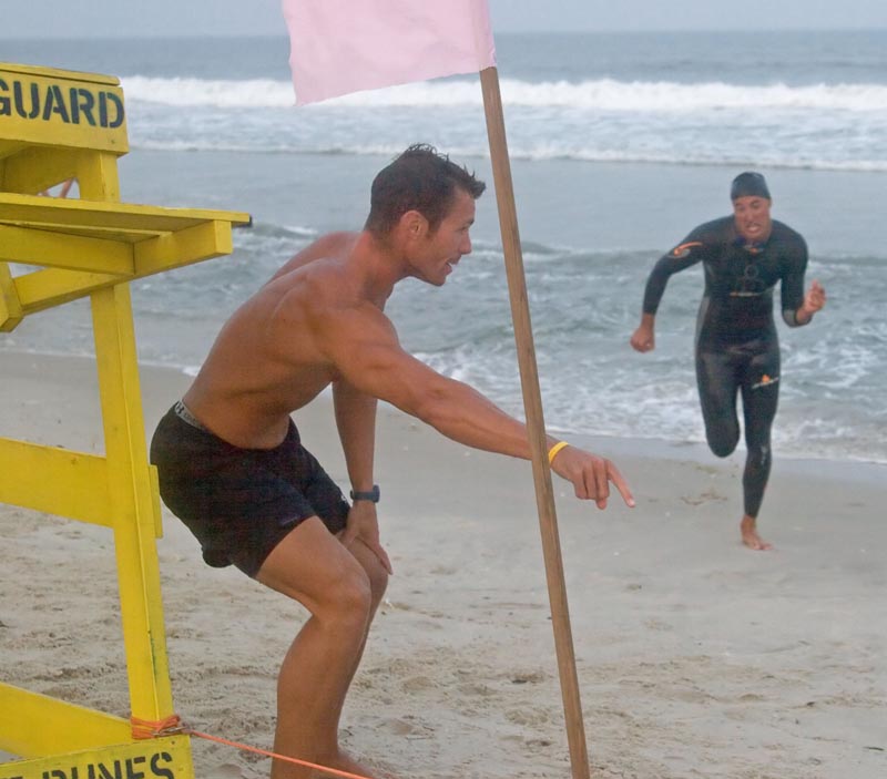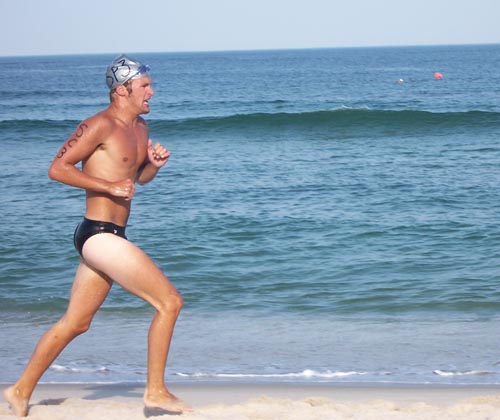 As most of you know, the name "Epic" was coined by Lt. Mike Nitti many years ago. "Back in the day," as the older guys like to say, workouts generally consisted of a soft sand run from 6th street to the North Beach jetty, hard sand run to the 15th street jetty, a two jetty swim to the 7th street jetty, and a final run to the 6th street stand. Mike began to refer to this workout as "the Epic" and the name kind of stuck. Actually, I remember he used to ask before workouts, "Are we going to do that epic workout again?" For you Epic historians out there (Tony Nitti), the "Super Epic" extends the Epic with a run down to the first jetty in Ship Bottom and adds another jetty to the swim to make it 3 jetties. In those days, workouts were at 8:30 so everyone could train in the same Epic. The "ultimate" Epic competitors were Jim Inglese, Dan Glass, and Rich Freda. Who was the fastest? Tough to say since they never competed against each other at their respective best. If I had to go out on a limb I'd say Rich Freda, then Jim Inglese, then Dan Glass. Rich was just too good a runner and swimmer. I've raced against Rich many times and can tell you that only last year's winner (a pro triathlete) would have beat him.