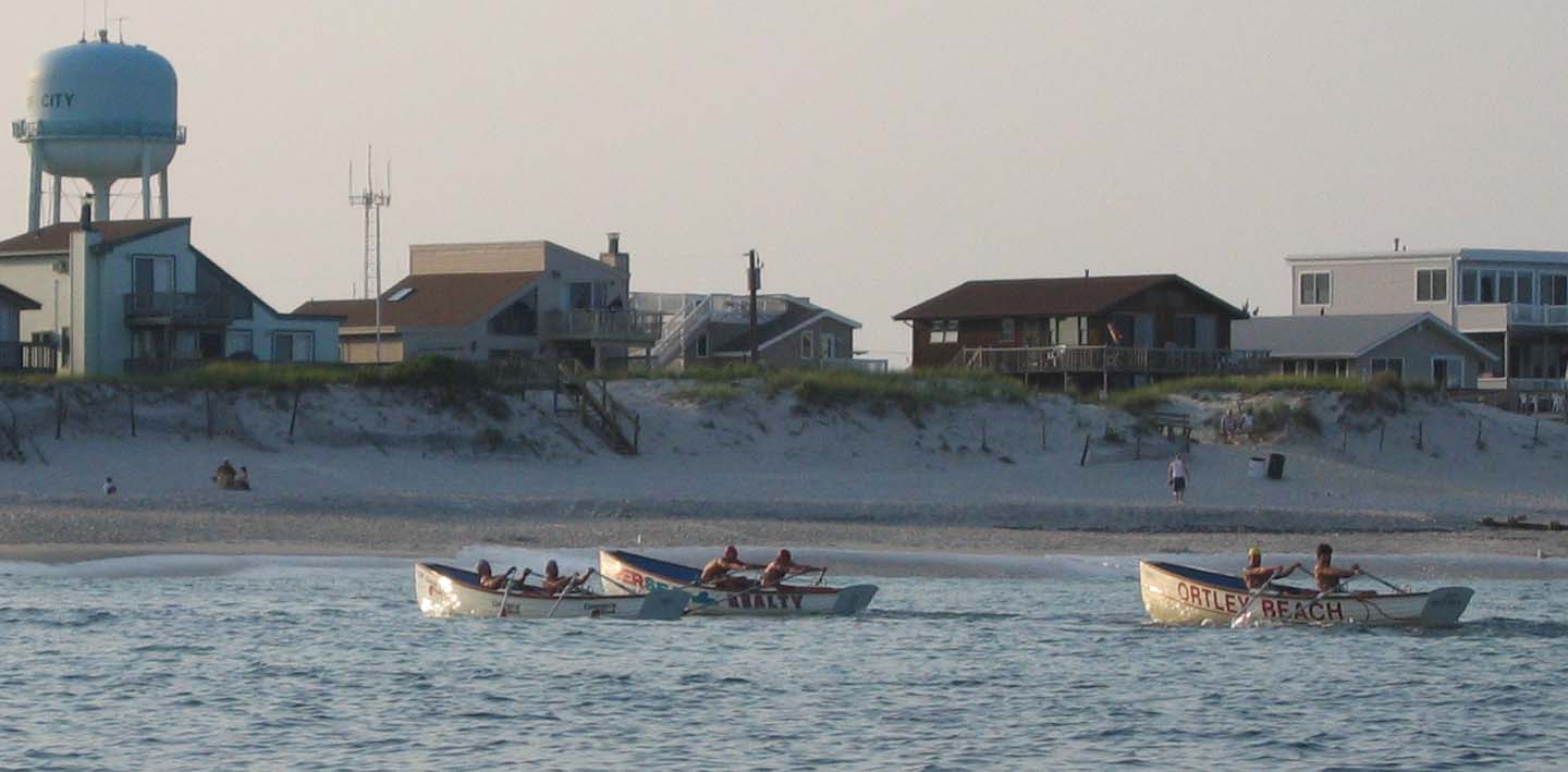 If my memory serves me I think it has been since 1987 since Surf City has attended the Ortley tournament. I remember after the tournament at the after party at Joey Harrison's that they had a keg toss. I wonder if they still do that? Anyway, the first event was the 1000' doubles row and it's was Mike and Rip's first time rowing in a race together. The waves were huge and they got hit by a pretty big set on the way out. As Rip noted in the tournament logbook "huge waves, biggest surf ever." That pretty much sums it up surf-wise. Adam, Ashley, Darren, and Taylor did a nice job in the swim relay for an "in the points" 5th place finish. I believe there were 10 teams in this tournament.