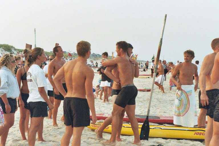Rip and Darren getting launched before winning the Row-Out/Swim-In