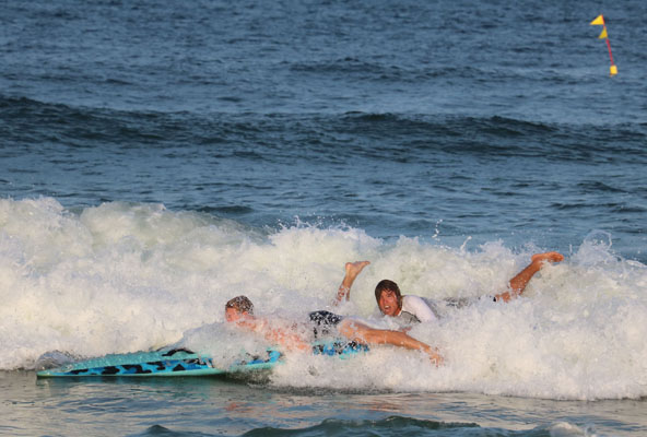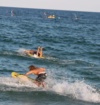 Scott and Pat H. had been working hard on perfecting their technique in the paddle rescue and had become nearly flawless with Scott knee paddling while Pat prone paddled. This is nearly impossible to do on 12’ race board. I really don’t know how they were doing it on a 10’6” board. Scott and the Harvey Cedars paddler reached the buoy at about the same and the race to the beach was on! Harvey Cedars was just a little faster so we’d have to settle for another 2nd place in this event. Great job though, very impressive. This was the closest race HC has had in a decade!